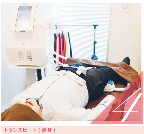 これまでの痩身器具の「脂肪を減らす」だけではなく、電磁パルスで筋肉を強化し筋肉量を増や す新たな痩身法。筋トレが出来ない、苦手な方にもおすすめのボディシェイプ技術。尿漏れや出 産後の骨盤の歪みを改善する「膣トレ」と呼ばれる骨盤底筋を強化するメニューも用意。