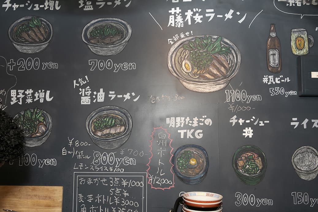 築50年以上、アメリカヤ横丁内にあるラーメン酒場 藤桜は昭和の雰囲気が満載。お店のテーマは 「日々進化するラーメン酒場」。その名の通り、メニューのラーメンやおつまみは日々さらに美味し く、お客さんのニーズに合わせて変化している。行くたびに味が変わる“ ちょっとおもしろい ”ラーメン酒場。夕方の18時になれば暖簾が掲かり、店主の藤巻さんが笑顔でお客さんを迎える。誰とでもフランクに話す藤巻さんとの会話を楽しみに来店する方もいるそう。そんな藤巻さんのおすすめは「おまかせおつまみセット」(1,000円)。3種類のおつまみが提供されおひとりさまでもグループでも頼みやすい人気の逸品。もちろん他にもメニューは多数あり、店内の大きな黒板にイラストと共に描いてあるのでそちらもチェックしてみて。ちょこっとつまんでお酒を楽しみ、最後にラーメンで締める、これがラーメン酒場 藤桜の楽しみ方!韮崎駅から徒歩1分で市外からのお客さんも増えたそう。名物店主の藤巻さんと、進化し続けるラーメンに会いに行ってみて。