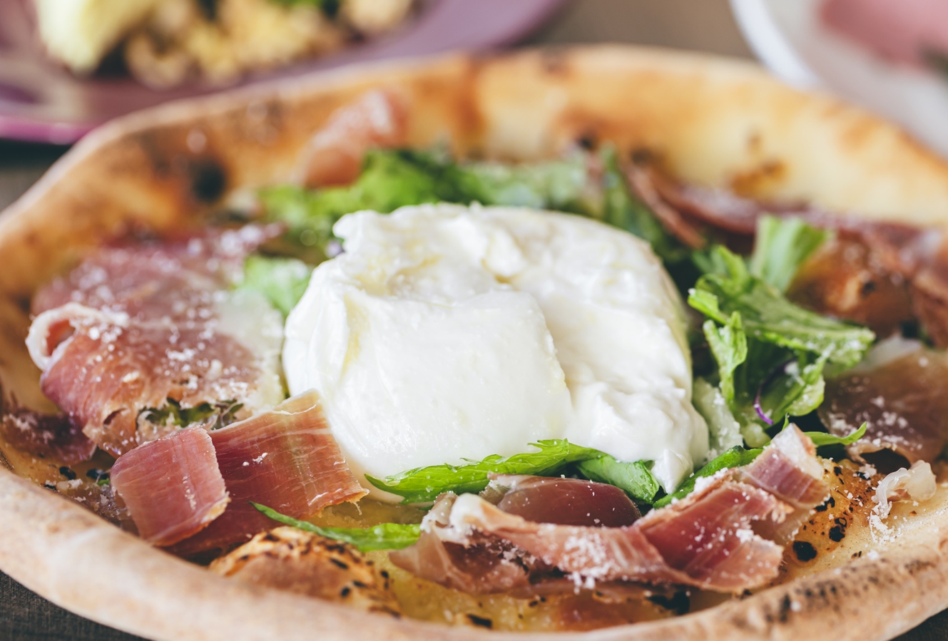 とろっとしたブラッディーナが丸ごと乗った、生ハムとブラッディーナのピザ 1,800円
