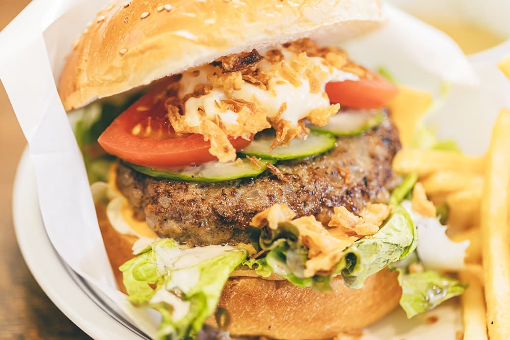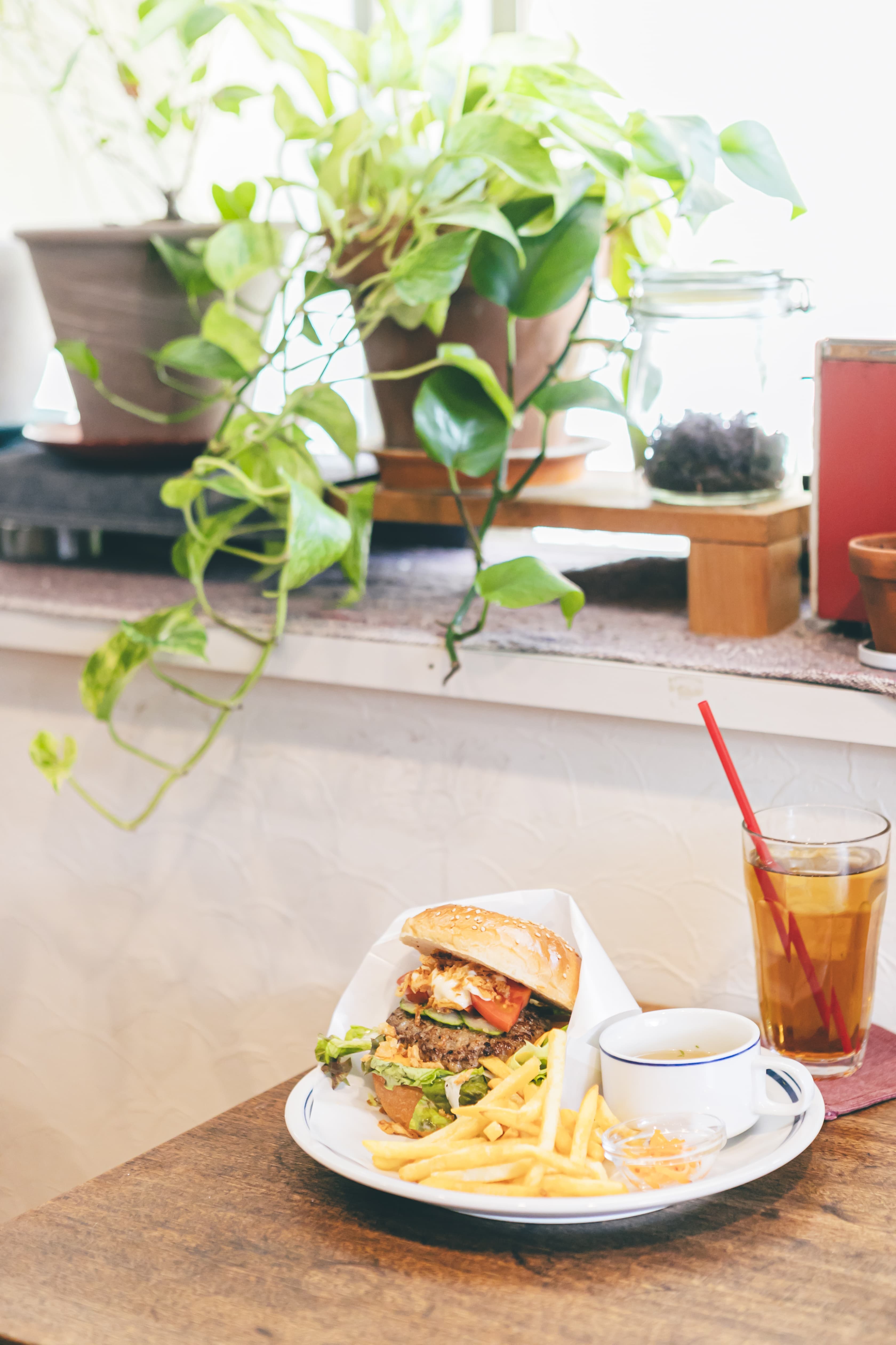 ランチ時には満席にもなる人気店HARAPEKO Cafe。特に人気なのがハンバーガーセット。ハンバーガーにポテトorサラダ・スープ・ドリンク・デザートまで付いたお得なセットを求め次から次へとお客さんが来店する。ハンバーガーはチキンかビーフをベースに7種類のソースからお好みのものを選べる。どちらも肉の旨みを存分に感じられ、新鮮な野菜たちとの相性も抜群、女性でもぺろりと食べられてしまう。ハンバーガーのイメージが強いがタコライスやロコモコ、ルーローハンなどのご飯ものもあり、こちらのファンも多い。もともとオーナーはフレンチのシェフのもとでフレンチを作っていたそう。ある時イベントでハンバーガーを作る機会があり、それが好評だったことからハンバーガーの道へ進んだ。オープンから現在までオーナー1人で店を切り盛りするのも「1人でやりたかった」という思いが込められている。店内の内装もレトロかわいくオーナーのこだわりが伺える。時間を忘れてくつろげるのがHARAPEKO Cafeなのだ。