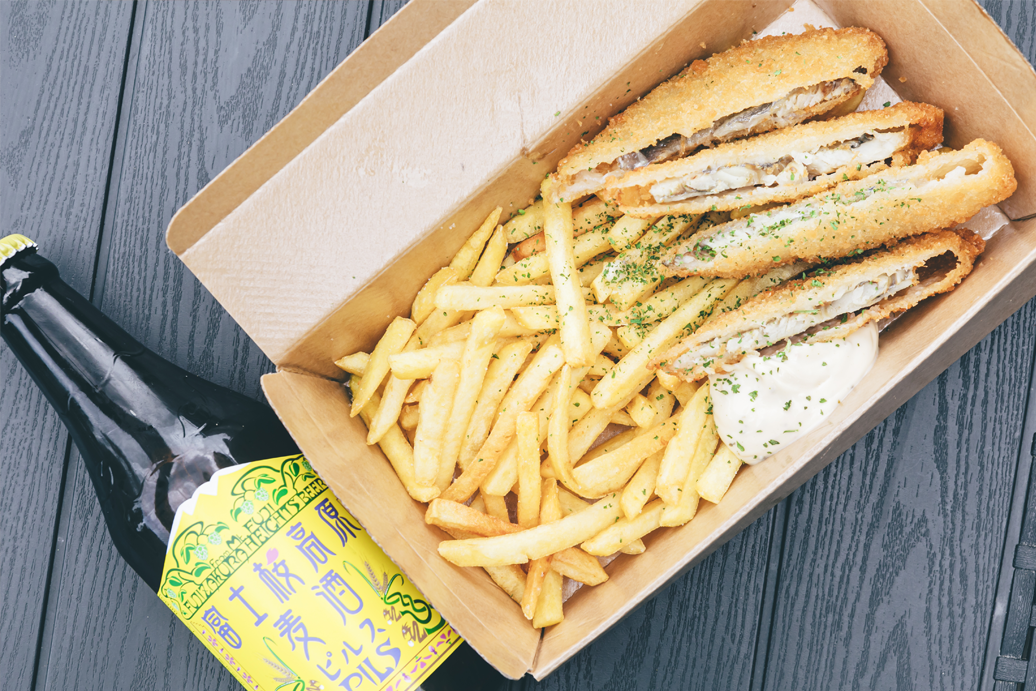 揚げたての白身フライとポテトと冷 えたビール。昼間からテラス席でお 酒とおつまみを楽しむのも◎