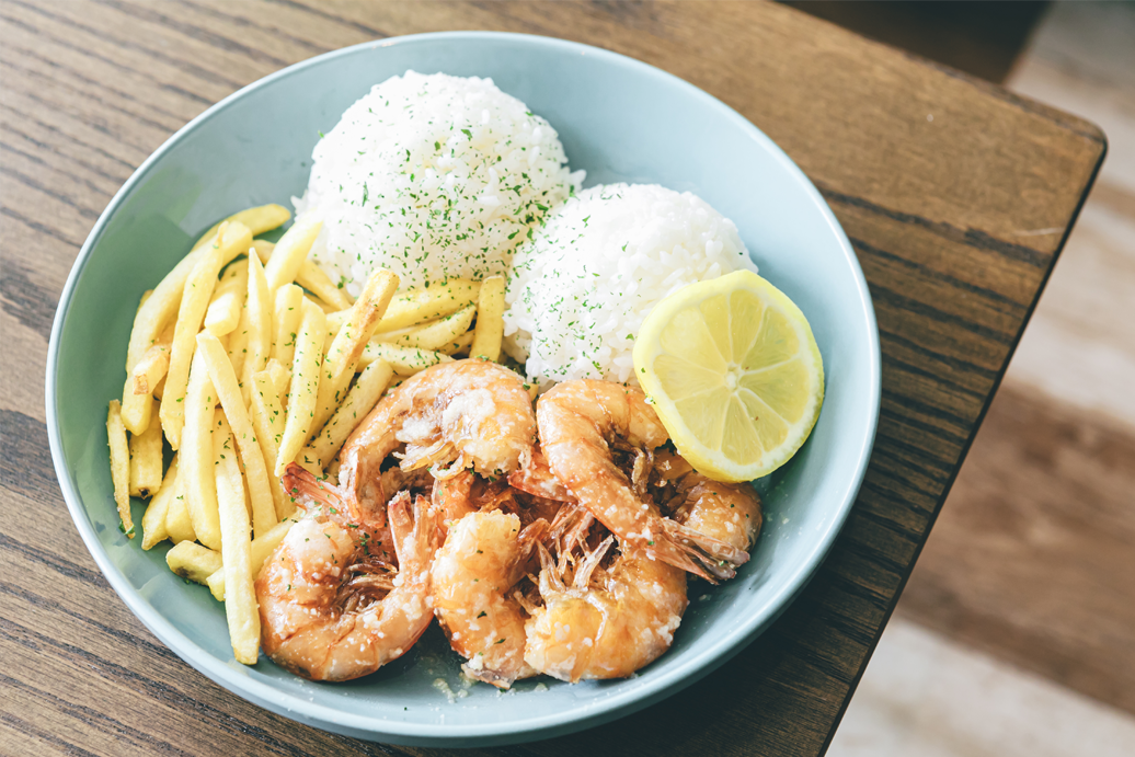 数量限定の LA2CAFE 特製メ ニュー。運ばれてきた瞬間から広 がる、ガーリックの香ばしい香り に食欲がそそられる。