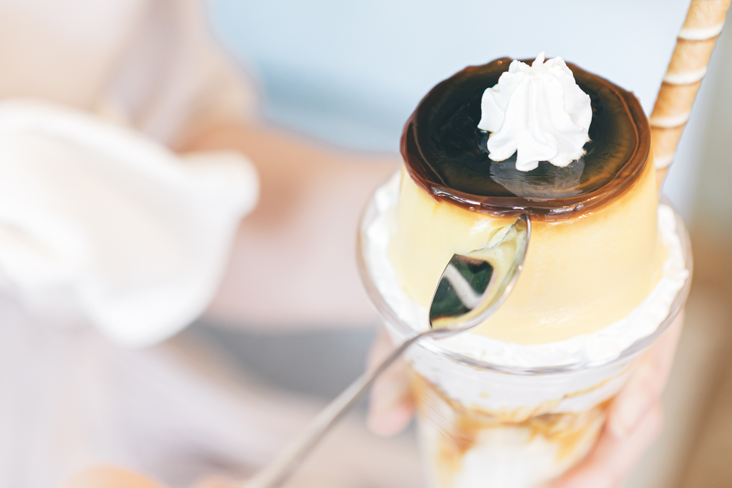 プリンがまるまる 1 つ乗ったプリン好きは外 せないパフェ。中には北海道で作られたしっ とりスポンジなど北海道の食材がたっぷり。 プリンパフェ以外にも数種類のパフェを用 意。また、数量限定でシーリング缶に入った パフェ缶 (¥500) も販売中!
