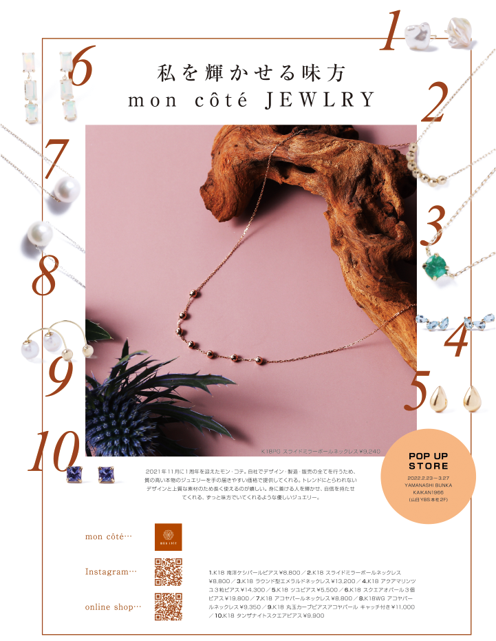 2021年11月に1周年を迎えたモン・コテ。自社でデザイン・製造・販売の全てを行うため、質の高い本物のジュエリーを手の届きやすい価格で提供してくれる。トレンドにとらわれないデザインと上質な素材のため長く使えるのが嬉しい。身に着ける人を輝かせ、自信を持たせてくれる、ずっと味方でいてくれるような優しいジュエリー。